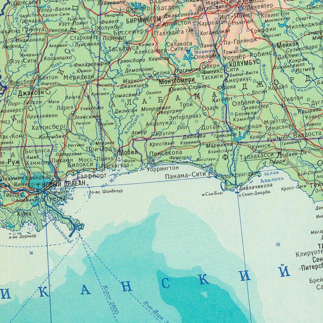 这里提供了大量有关美国地理和经济的详细信息。主地图用阴影表示海拔(和水深),并标明了不同大小的定居点、行政边界、基础设施(公路、铁路、港口等)和地理特征。小插图显示了美国大陆以及阿拉斯加和夏威夷,比例为 1: 100000000。