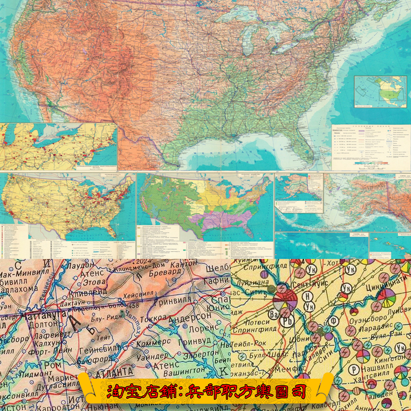 主地图下方有七张附加的插入地图。按顺时针方向依次为:与主地图风格相同的阿拉斯加地图;显示自然资源和基础设施(如发电厂和输油管道)的阿拉斯加经济地图;夏威夷经济地图;与主地图风格相同的夏威夷地图;美国农业地图,按行业(奶制品、牛肉、玉米、小麦、棉花等)进行颜色编码;美国工业地图(黑色冶金、有色冶金、化学品、纺织等),也按颜色编码,用元素周期表中的化学元素符号标注矿山,包括发电、管道、港口年货物周转量以及与地图上各个地方相关的数字(大概是因为没有空间写名字);最后,美国东部工业中心地图,使用下方工业地图中的符号和颜色编码。20 世纪 70 年代的美苏关系