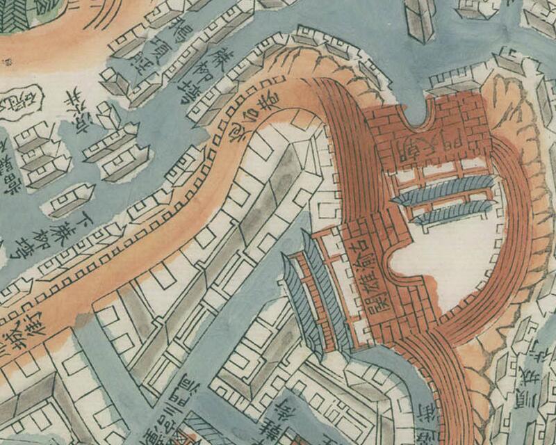 在《重庆府治全图》里,张云轩用半写意半写实的手法,把重屋累居的重庆老城淋漓尽致展现在我们面前,我们可以看到府文庙的泮池经阁,巴县衙门的仪门大堂,较场口的杂货街道,还有码头边的梯坎石堡。一个既充满中国传统气息又具有独特风味的市井城市跃然纸上,让所有未曾亲身经历过的吾辈重庆人,可以透过这份地图让心灵穿越到那个时候的重庆城。
