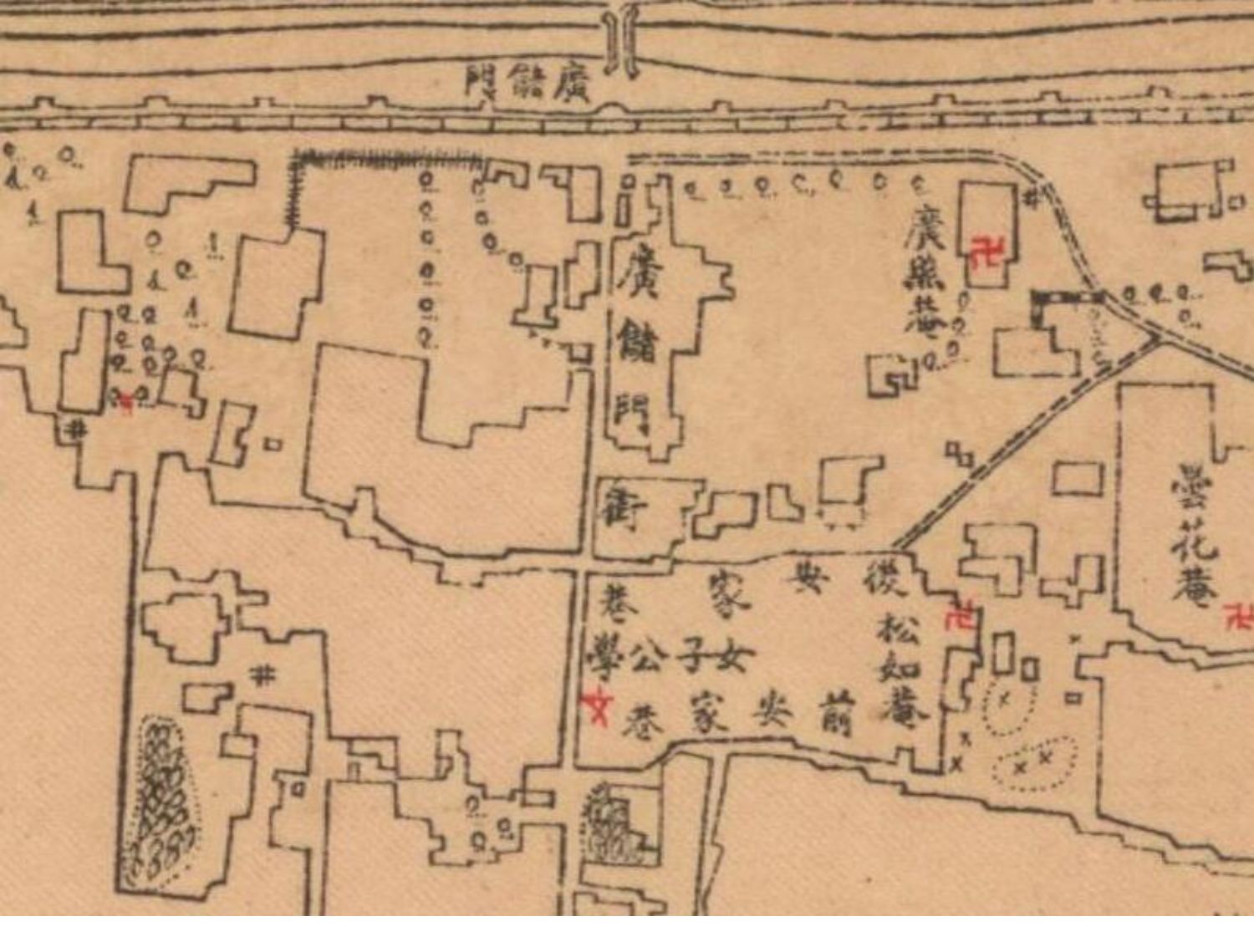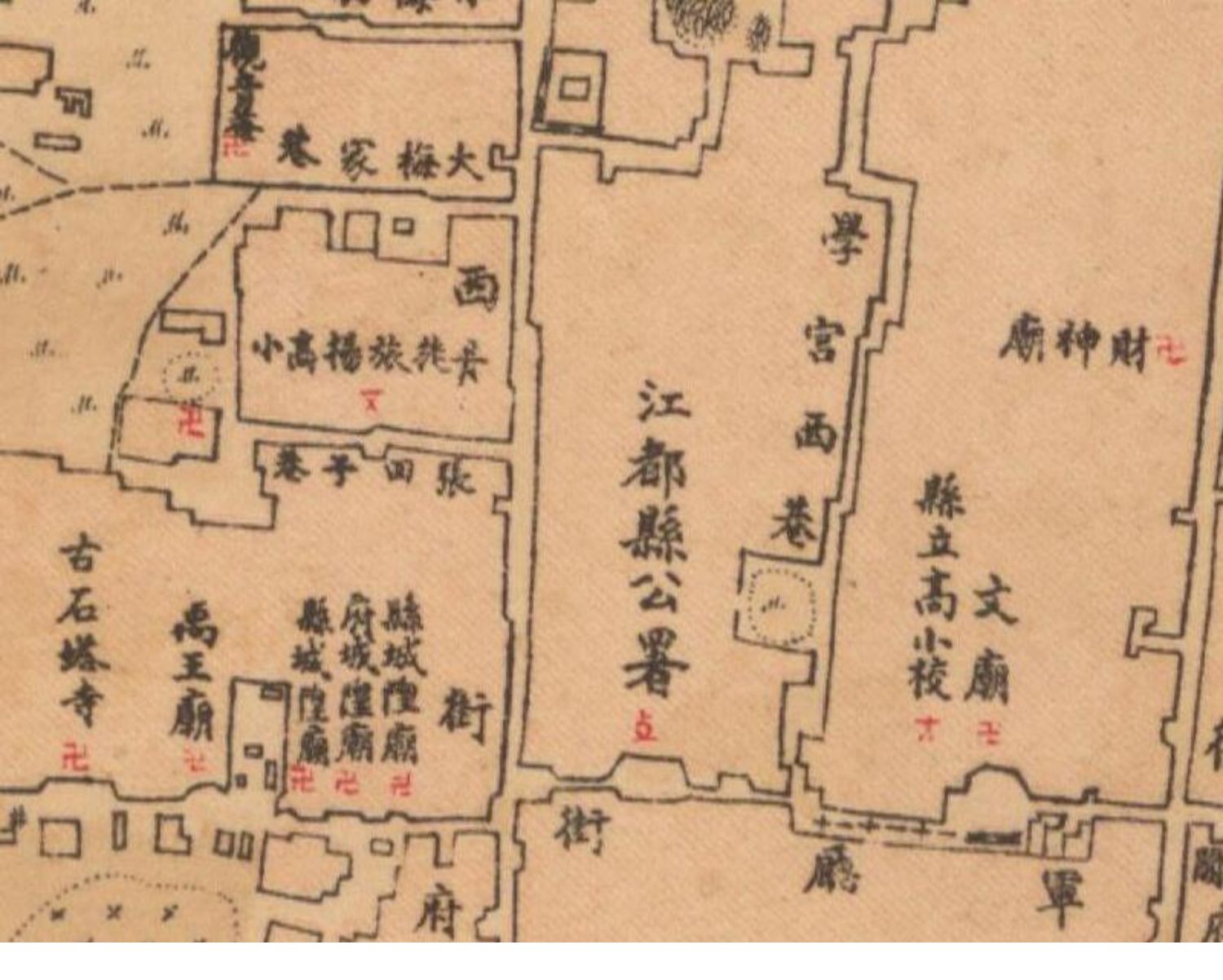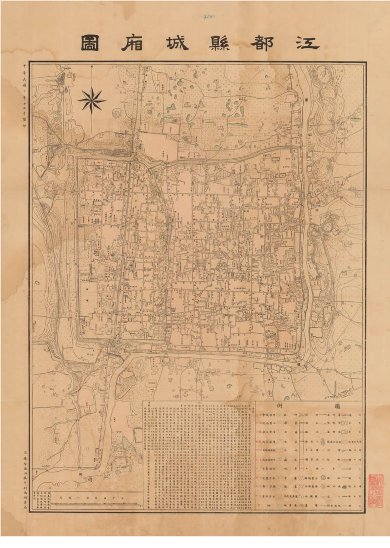 《江都县城厢图》全图绘制详细,衙署、机关、学校、街道、民居、农田、城墙、水塘、树林庙宇等极其详尽。开幅巨大80*110CM,是江都县珍贵城市史料,扬州及江都县地理地名历史变迁重要史料。