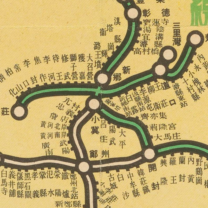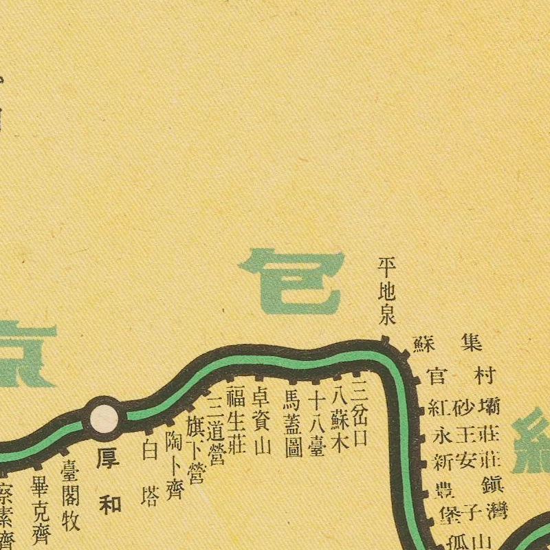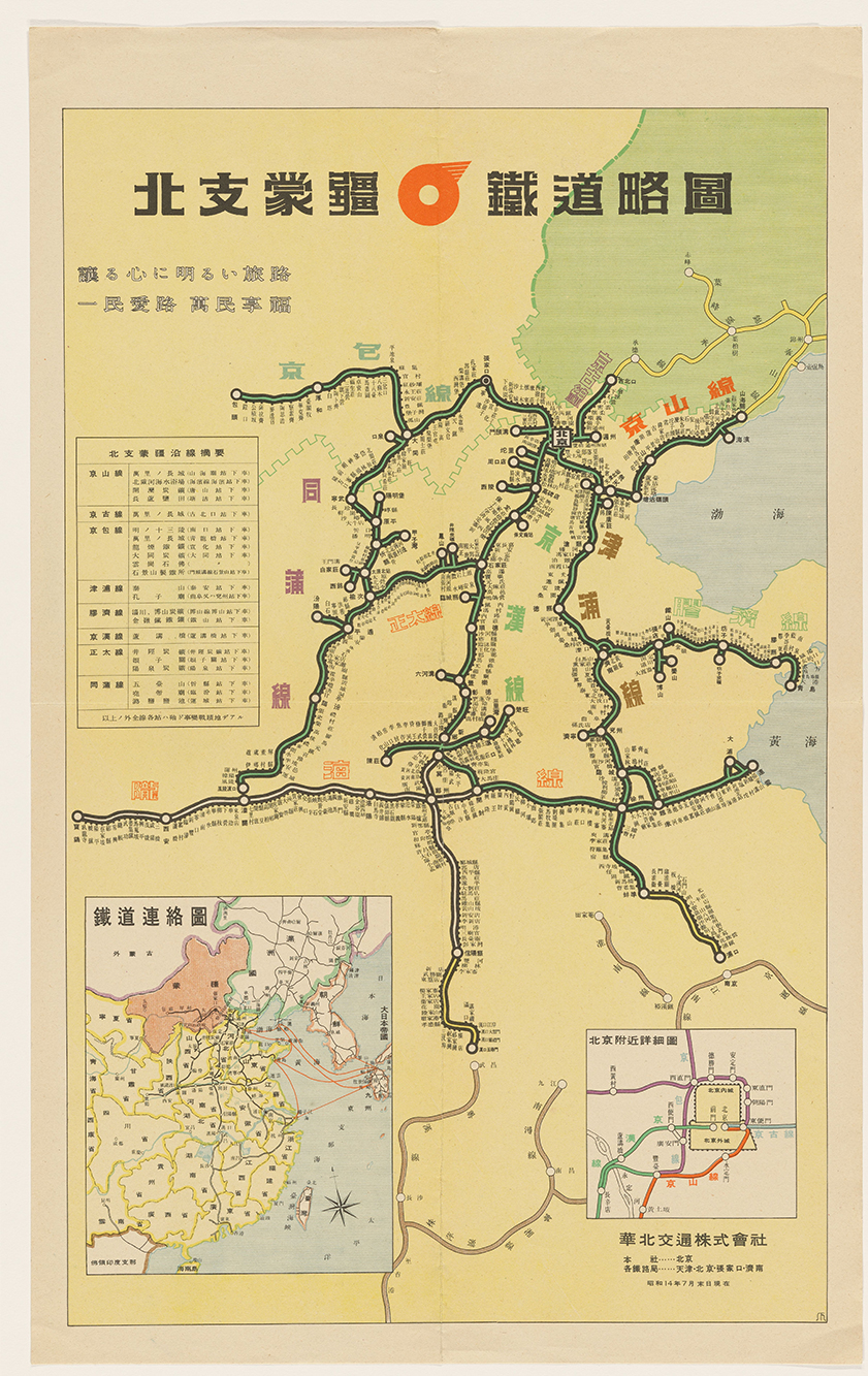 北支蒙疆鐵道略圖 昭和十四年[1939]7月底北京:華北交通株式會社。该图绘制了华北地区铁路线和各站站名,包括京汉线、津浦线同蒲线、京山线、京古线、京包线、陇海线、正太线、胶济线等。插图2幅:《鐵道連絡圖》为全国铁道网简图;《北京附近詳細圖》为北京城周边铁路线。另有附表罗列沿线著名景点。1图,彩色,日文,图幅65x37.6 cm,无比例尺和无经纬度线。像素:4905x7685px体积:7.67MB分辨率:300DPI