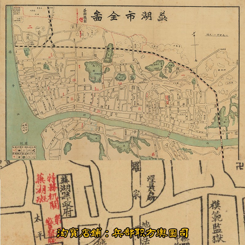 此《芜湖市全图》为民国28年(1939年)1月发行的安徽芜湖详细城市地图,绘制单位未知,比例尺为1/10000,原图为62cm*46cm中文彩色地图,现藏中研院。