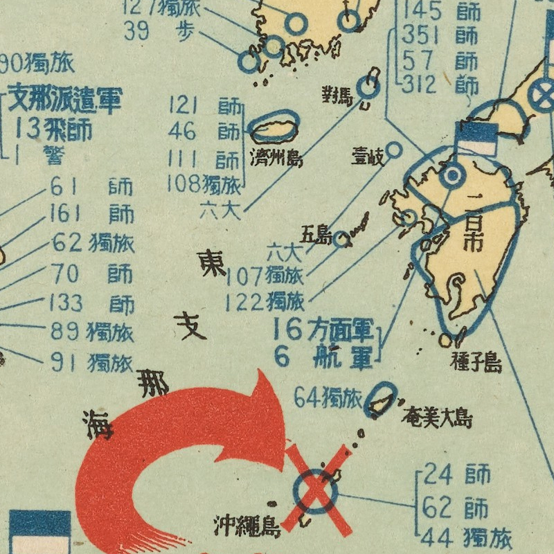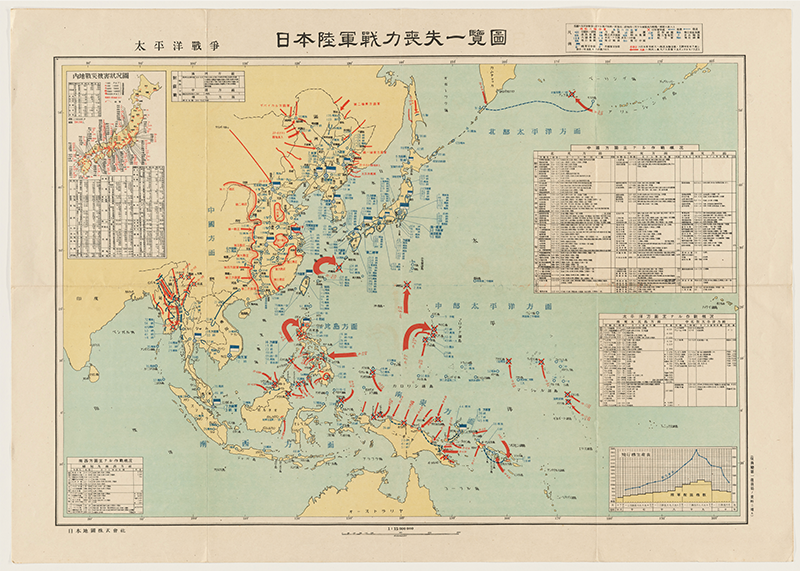 《太平洋戰爭日本陸軍戰力喪失一覽圖》 昭和二十二年[1947]4月30日,植野錄夫编辑,东京:日本地圖株式會社发行。 此图反映了二战反攻阶段东亚、东南亚和太平洋地区盟军与日军的战斗形势,包括东北苏军进攻路线、中国本部反攻路线、东南亚和太平洋诸岛美军进攻路线等。图中用蓝色标注了此时日军在中国、东南亚及本岛的军队部署及战争损失统计。附表罗列自1937年以来日本历次战争的名称、时间、参战部队及军力损失。另有《飛行機生産表》,显示日军战机的生产配备情况。 附插图1幅:《内地戰災被害状況圖》。