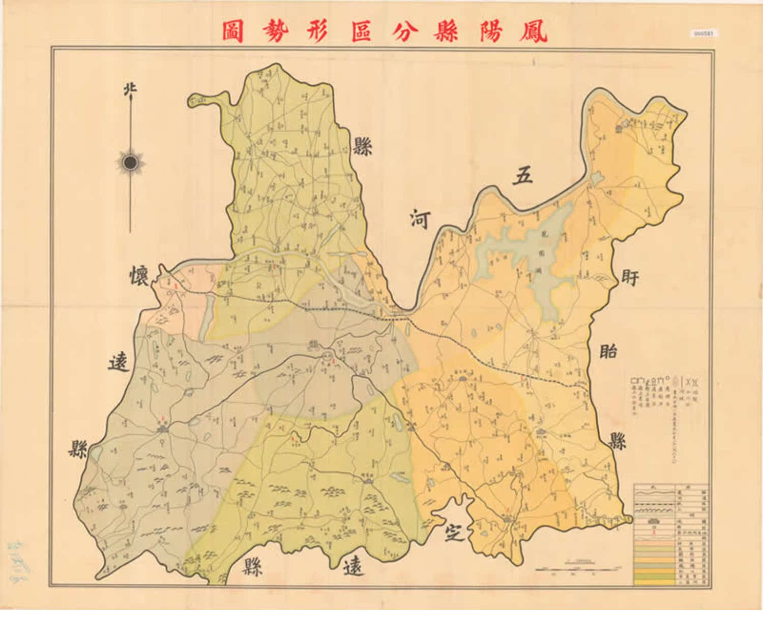 此《凤阳县分区形势图》为民国时期制图,地图上其它信息较少,难以确定著作者及制图年代,比例尺为: 1/100000,地图来源中研院。