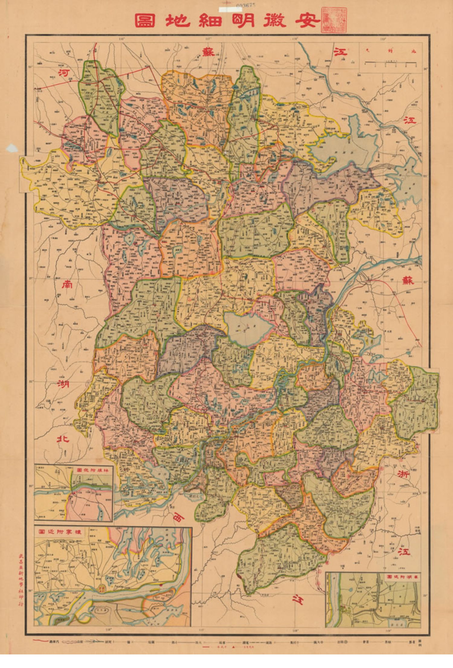 本图为一般行政区图,内容:县界、地名、河川、交通线、有大都市街道图,无地形资料。省会怀宁(安庆),62个县属以浅红、淡黄、淡绿、淡紫、土黄5色进行县域普染示出各县范围。