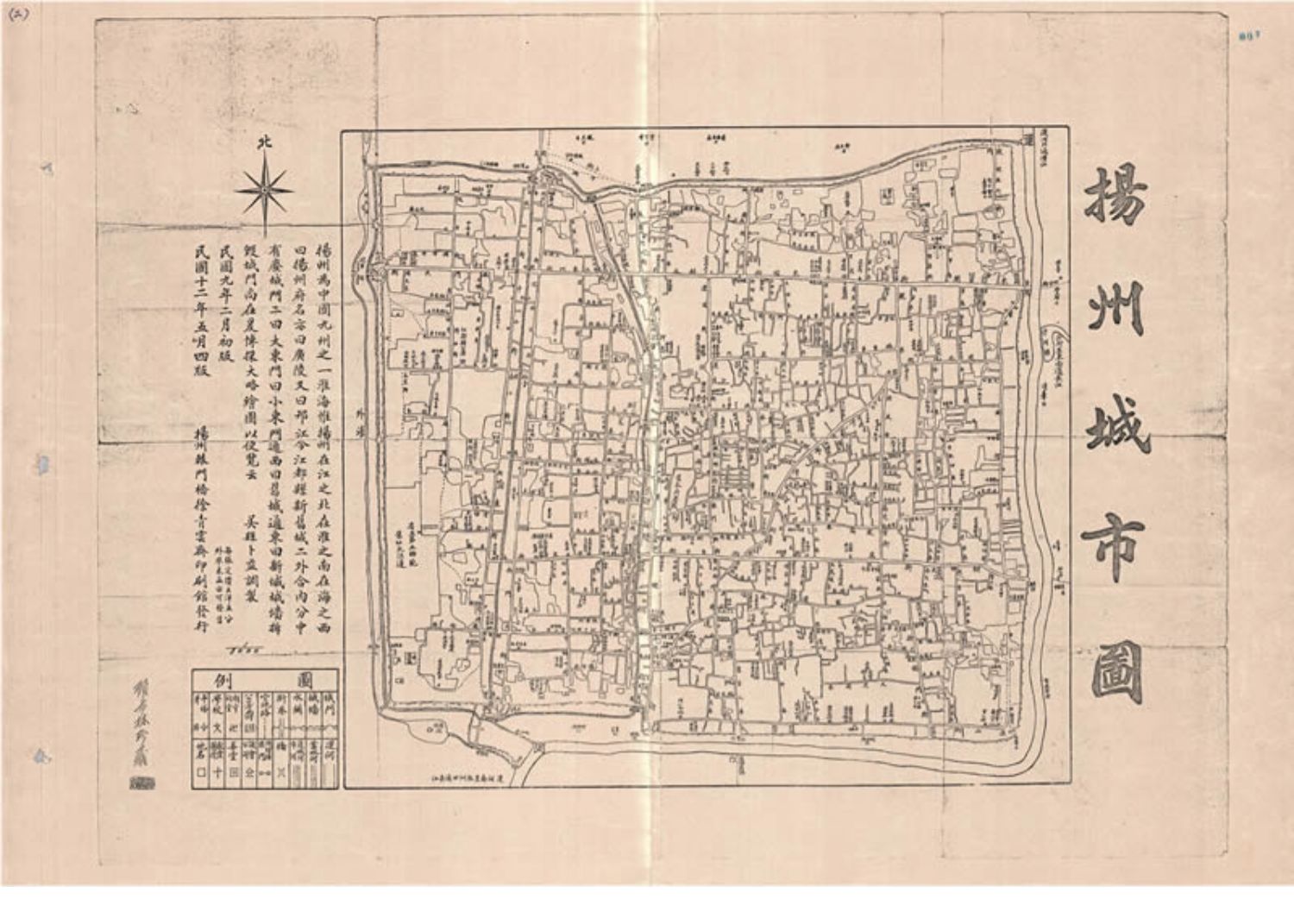 此《扬州城市图》为民国十二年(1923年),由扬州辕门桥徐青云斋印刷馆发行。地图上还有“顾希林珍藏”字样,地图比例尺为:1/8000。地图左侧附扬州简介及图例。