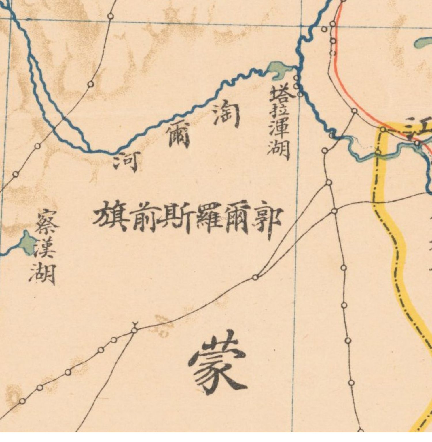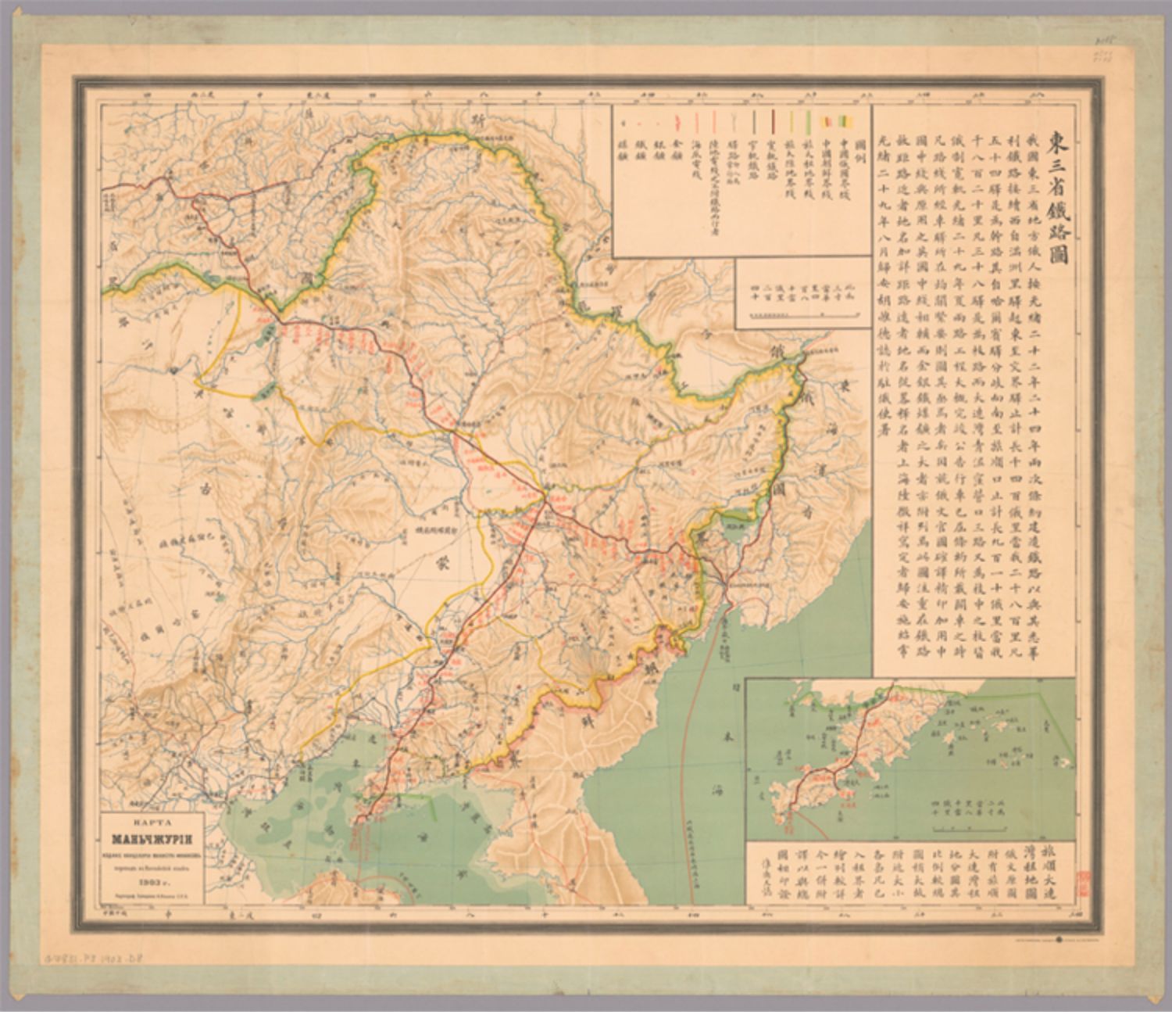 此《东三省铁路图》为清末时期(1903年)的东北地区铁路路线地图,地图为彩色多色地图,目前藏斯坦福大学。