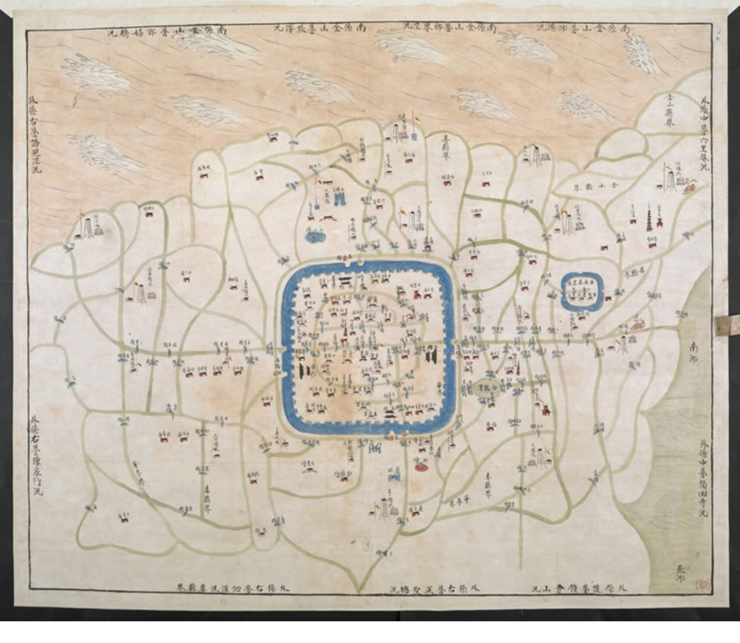 此上海《松江府川沙厅图》系以图中内容拟订;全图不附图例、比例,方位与相邻营汛标示于图沿四周,采南上、北下。图中以形象描绘松江城守营、塘汛、塔寺、庙宇、桥墩,营城内官署、书院、汛守,另在营城西门外历经长时间演变的“娄奉华仓廒”亦清楚描绘,图中各处有文字注记。原图尺寸 64×54cm,现藏大英图书馆。
