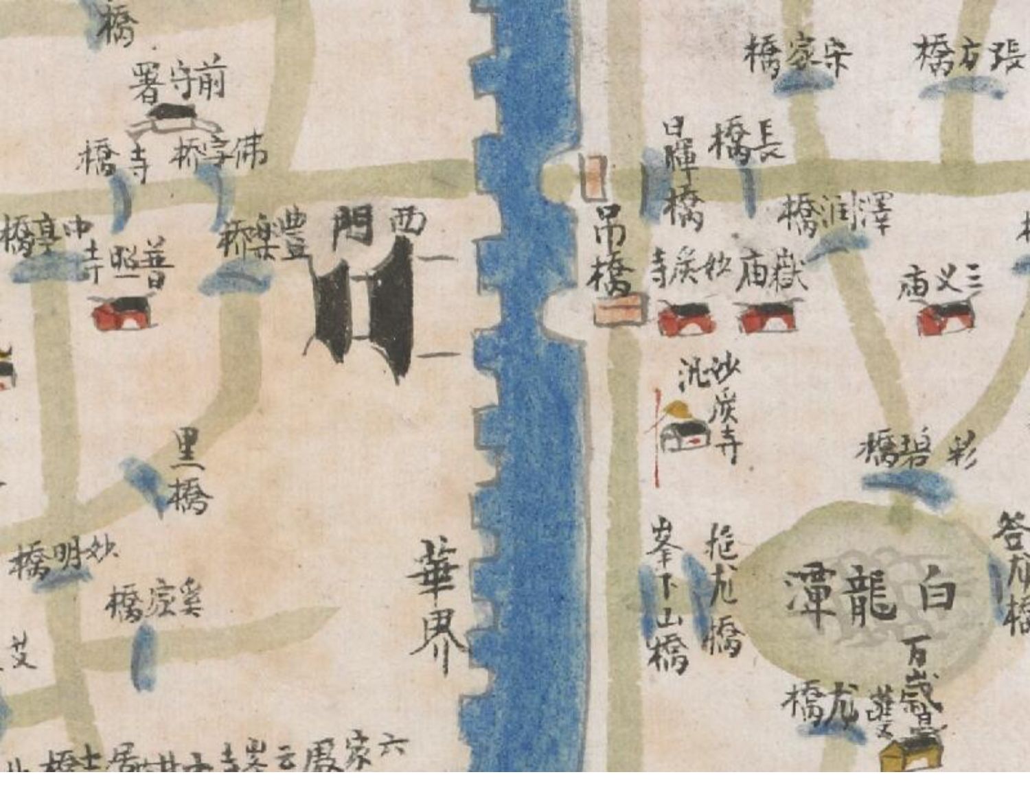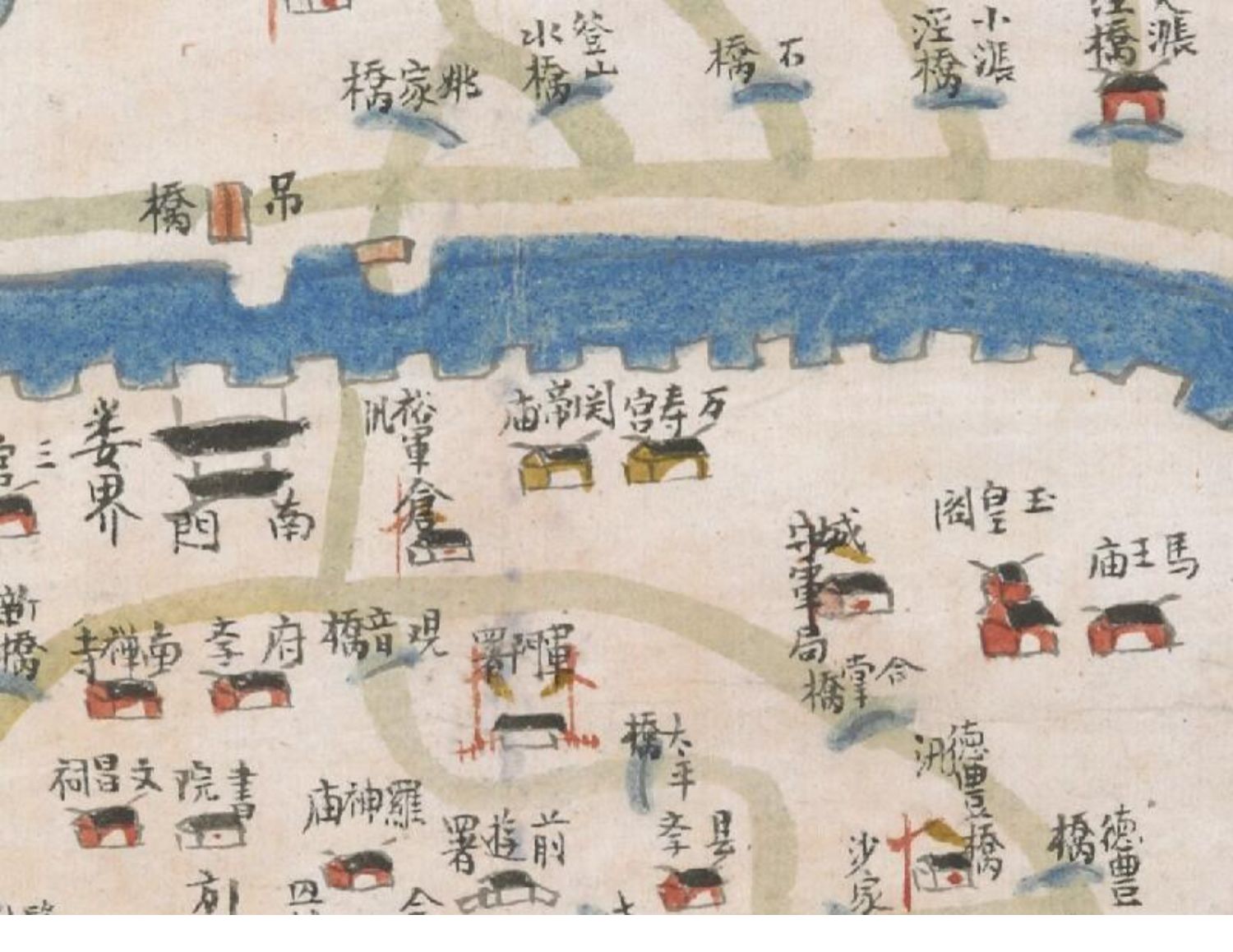 此图提标松江城守营属江南提督节制的城守六营之一,“顺治二年(1645)江南提督设立中、前、左、右、后及城守六营。……(松江)城守营,顺治二年设,驻札府城北,现辖华亭、娄、金三县境”(《松江府志》,卷34,〈武备志三.兵制〉)。营署、府署与华县署、娄县署同為一城。