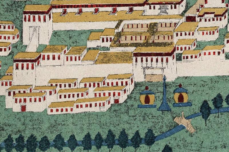 此拉萨地图为1891年绘制的拉萨示意图,英文名称《View of Lhasa》,为手绘风格的地图,非常精美。