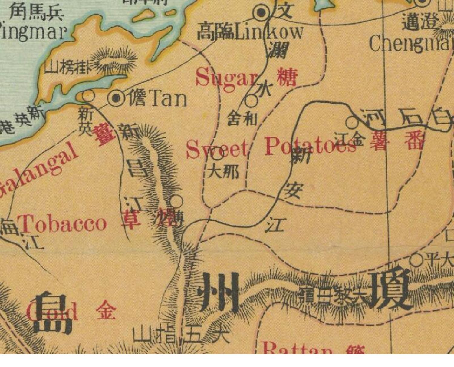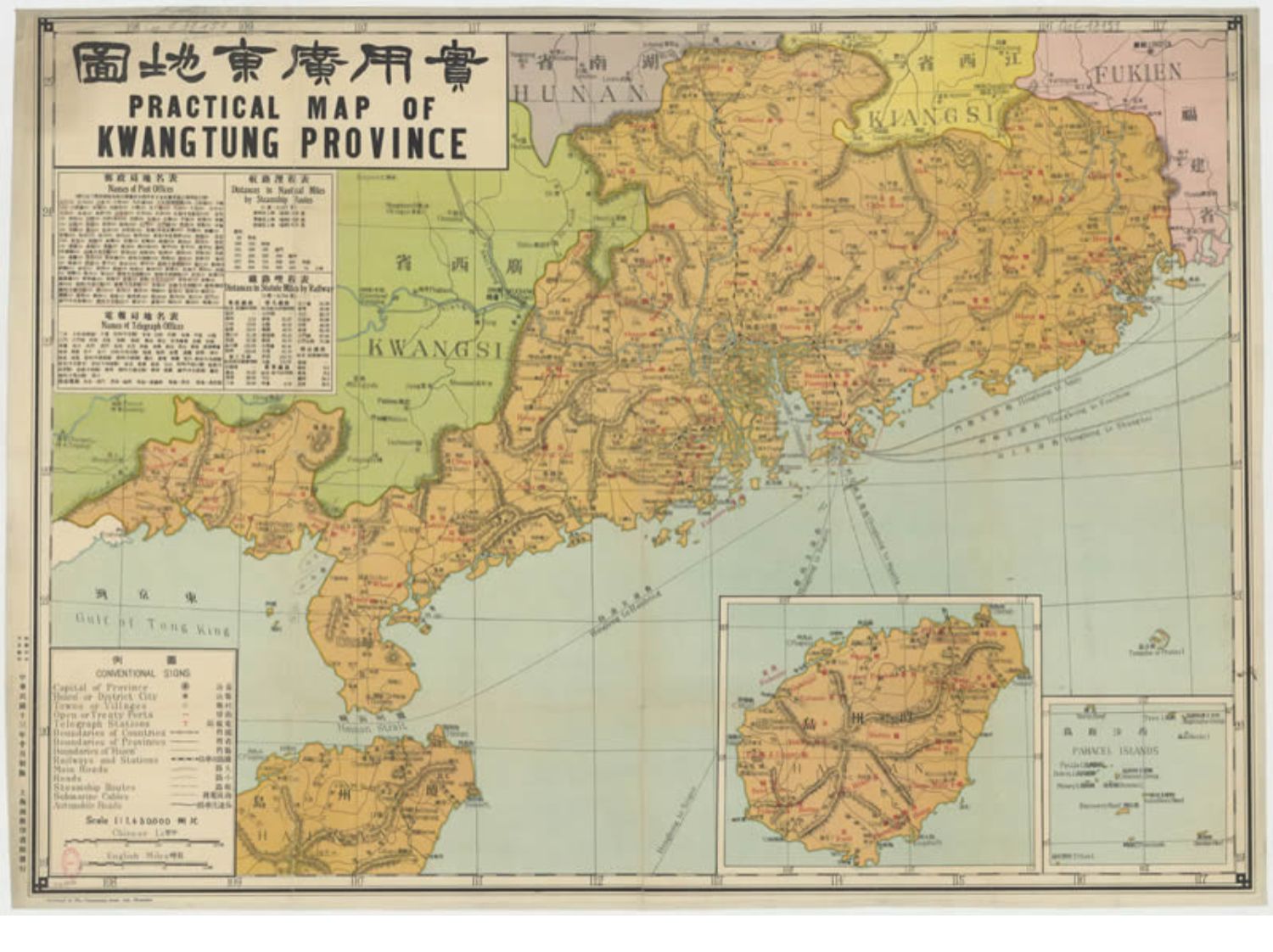 本地图上还附有《海南地图》、《西沙群岛》地图、《电报局地名表》、《邮政局地名表》、《航路里程表》、《铁路里程表》。