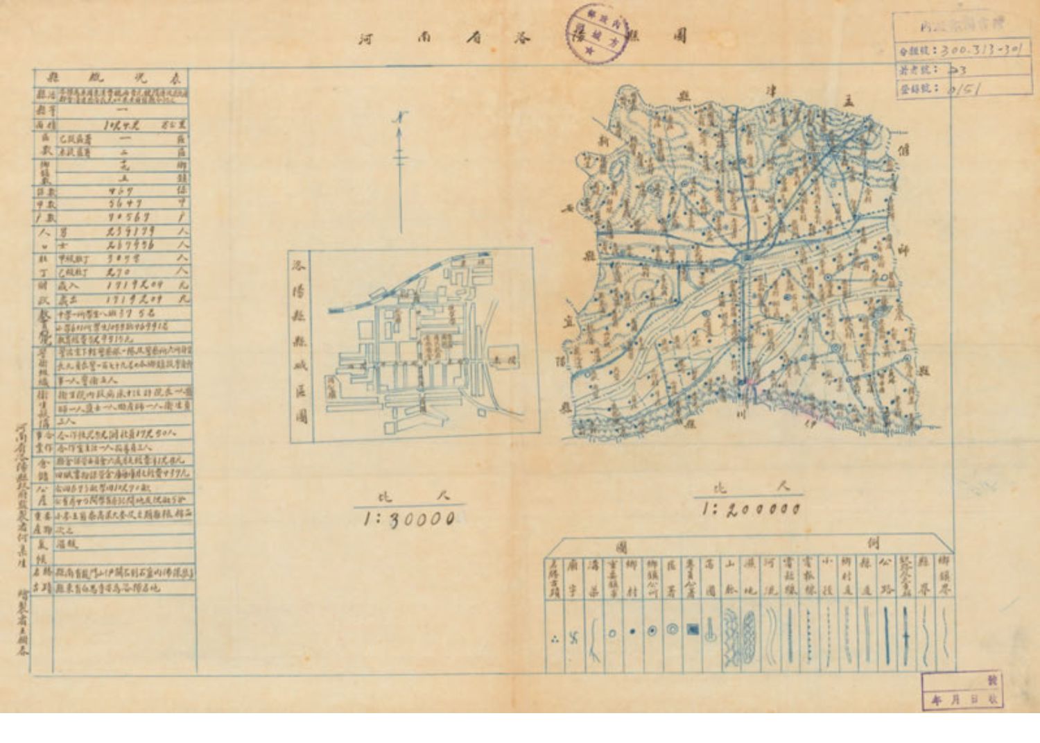 此《河南省洛阳县图》绘制日期约民国33-35年(1944-1946年),编绘者: 河南省洛阳县&政&府 王树春,比例尺: 1/200000,色彩: 素面2色图复写、毛笔字,主要绘制的是洛阳县乡镇界、交通线、山脉以示意表示,地名多,并附有县城附图及县概况表。