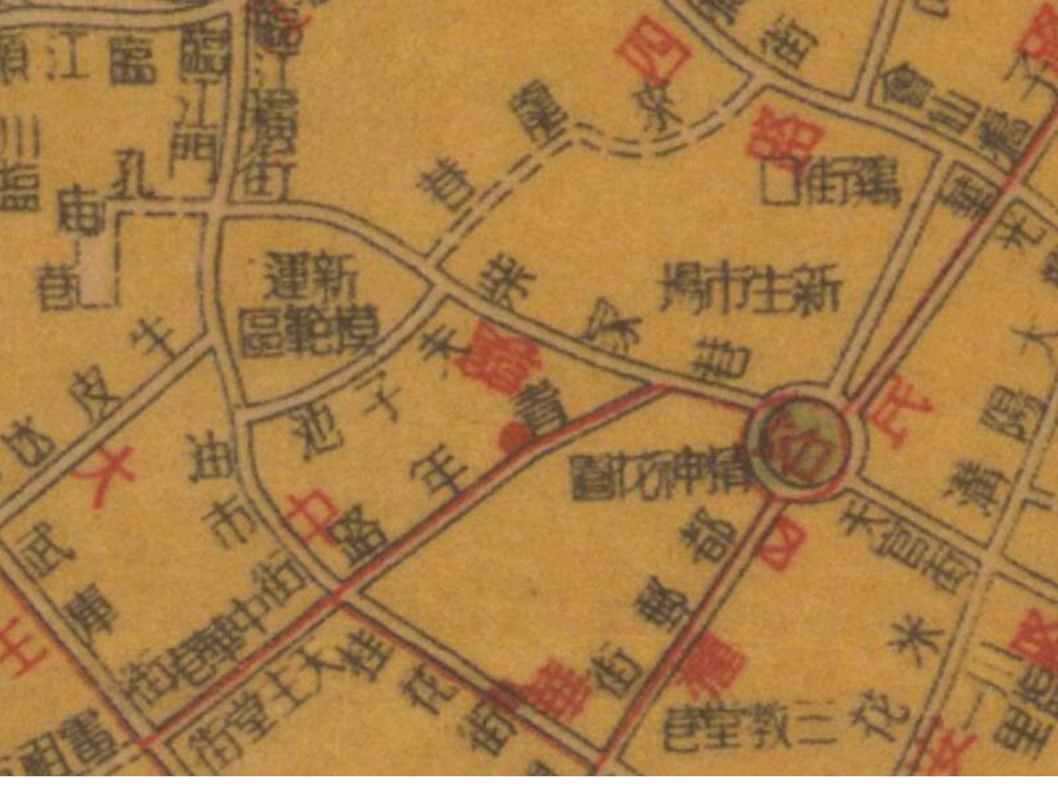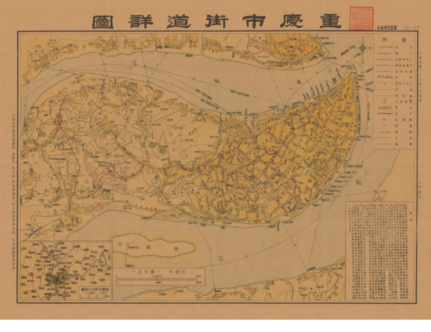 此《重庆市街道详图》为民国35年(1946年)1月由亚光舆地学社出版,中国史地图表编撰社 金擎宇 陆先灵 陆乘阴编制,比例尺:1/10000,地图左下角附《重庆市附近交通图》,中研院藏。