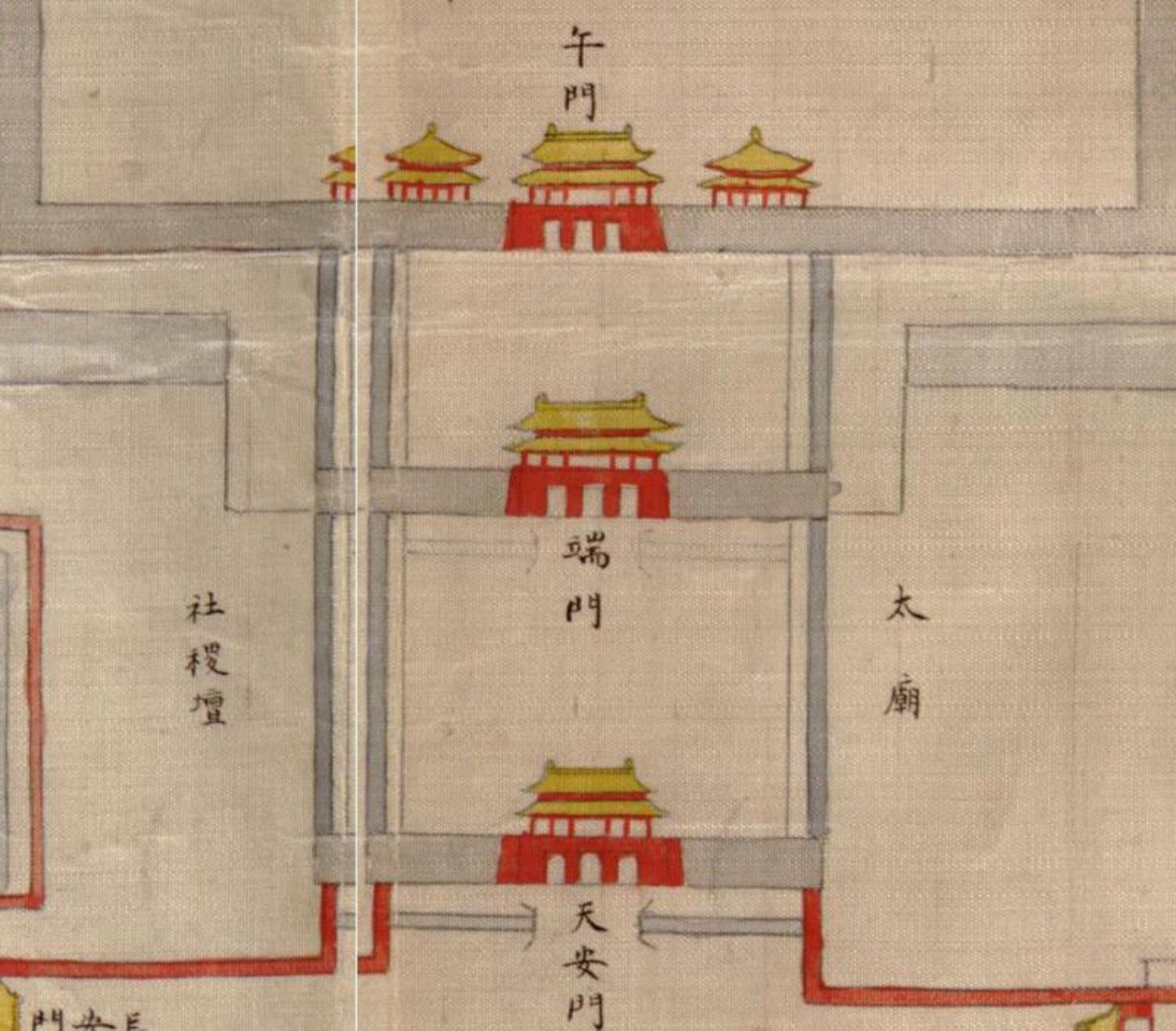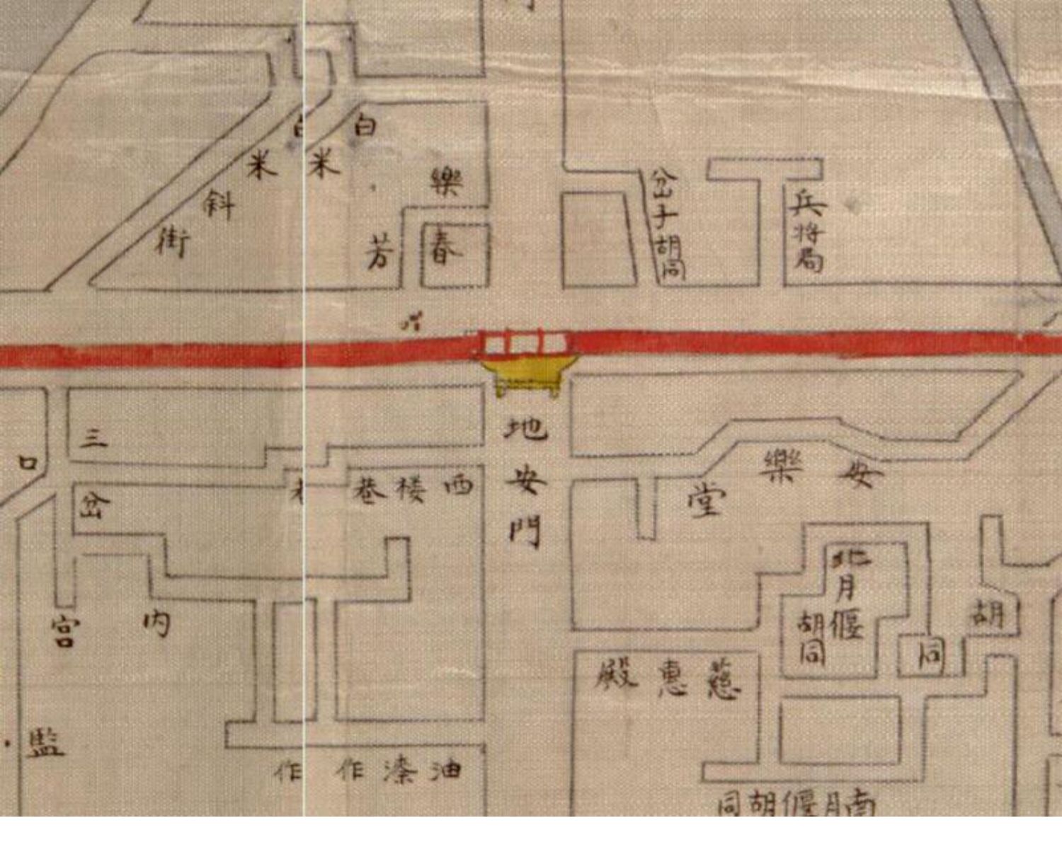 《京师九城全图》原藏于美国国会图书馆,全图以墨色描绘京师,紫禁城在图中央部分,以红线画出范围,但未注记任何符号。“九城”指的是北京内城的九座城门,分别是安定门、德胜门、西直门、阜成门、宣武门、正阳门、崇文门、朝阳门、东直门。