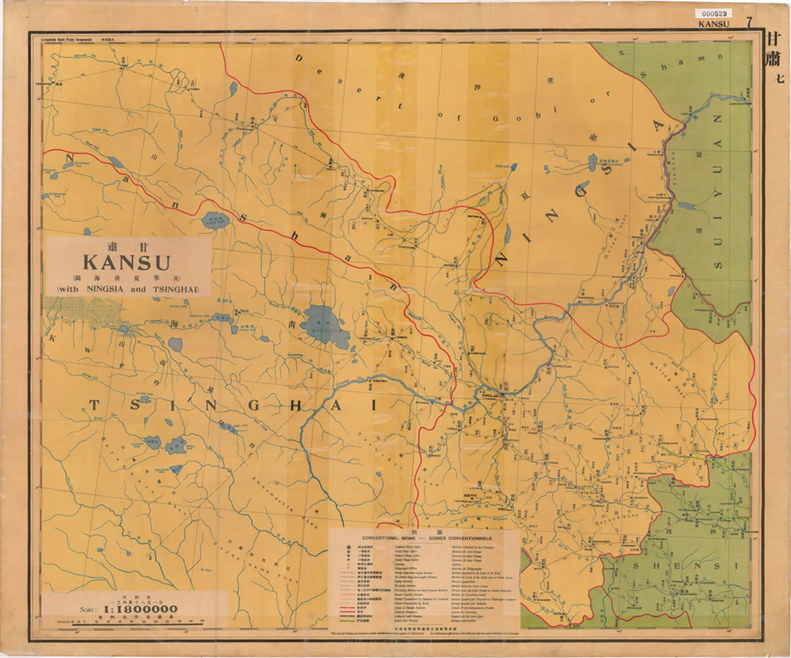 此《甘肃邮政舆图》出自1933年《中华邮政舆图一书》。该书中内容包括舆图总目及航空邮路图,中华民国各分省地图,同时有各省邮务局所暨邮路,附录中包括地名索引、新旧名称对照、铁路简表、航空简表、航海简表及英文地名索引。