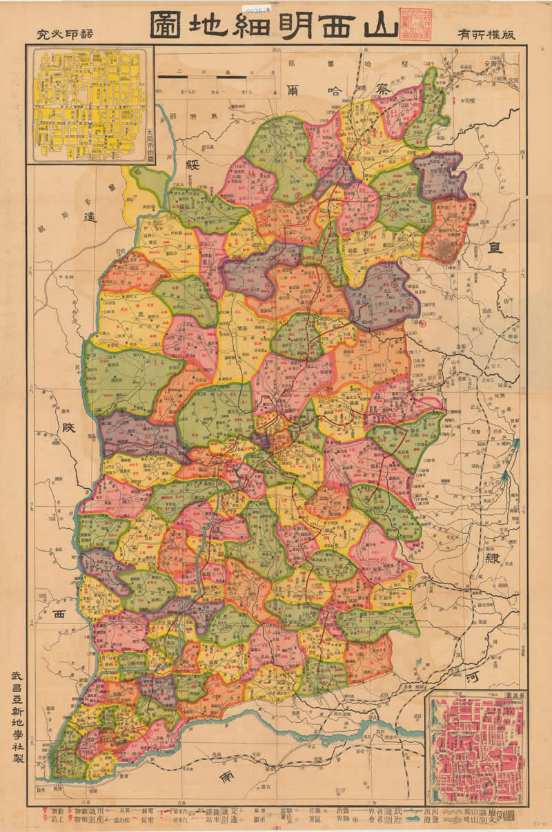 此《山西明细地图》为武昌亚新地学社出版,可能的时间为1938年后,彩印本地图,比例尺: 1/1000000,原件尺寸: 55cm*80cm,原件藏中研院。