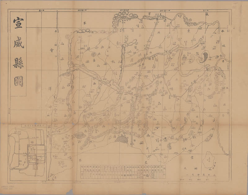 此《宣威县图》可能为民国早期云南宣威地图,具体年代未知,所获知的其他信息较少,比例尺:1/200000,地图左下角附《宣威县城街市略图》,地图来自斯坦福大学图书馆。