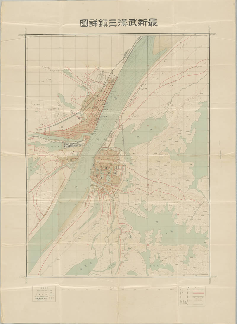 此《zui新武汉三镇详图》为昭和13年(1938年)11月20日发行,发行所:日本名所图会社,著作者:小山吉三。原图大小:109*79厘米,彩色地图。地图来源:日文研。