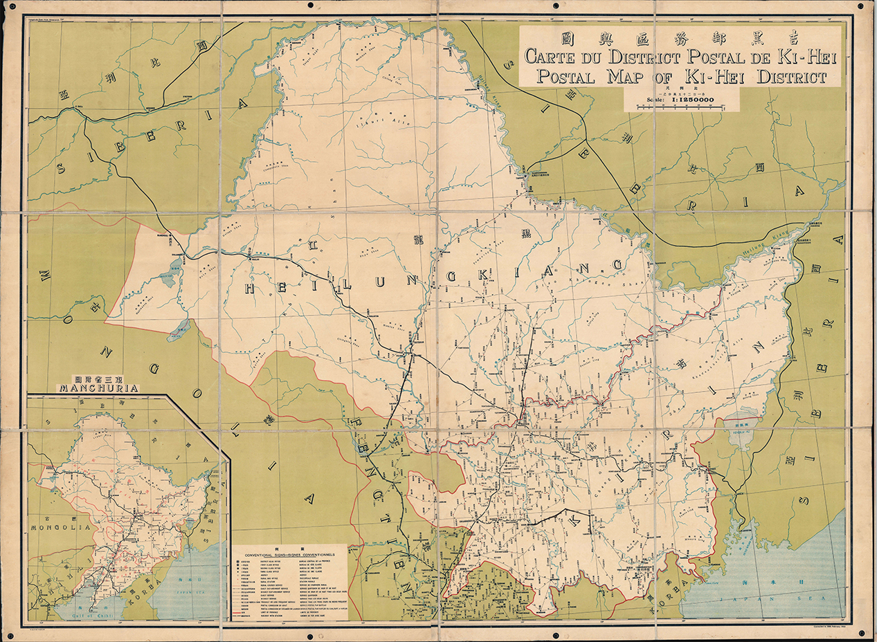这是一幅令人印象深刻的 1923 年官方三语(中、法、英)邮政挂图,当时称为北满洲吉黑。覆盖范围以区会哈尔滨为中心。