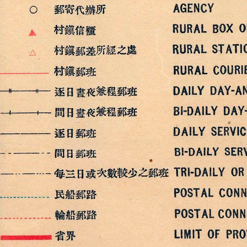 底部中心的一个键分解了该地图上未使用的这些和其他区别,例如“乘船邮政连接”表明该编码系统已用于该时期的其他邮政地图。有了这样的地图,中国邮政在 1931 年日本入侵满洲之前,在民国或中华民国时代(1912 - 1949 年),满洲分为两个大邮政区。