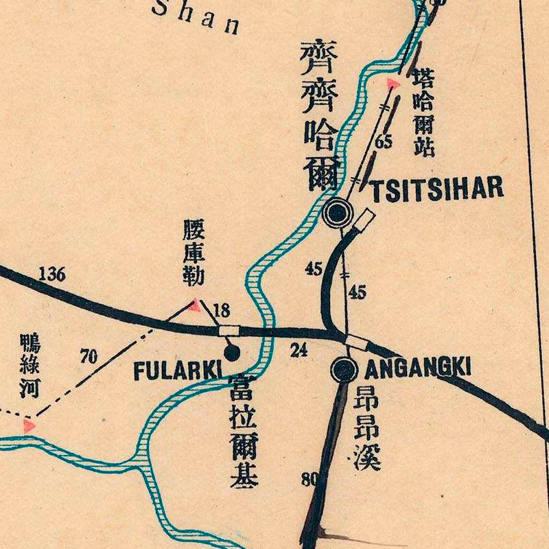 这张令人印象深刻的详细图表记录了邮政道路、河流交叉口和邮政地点之间的里程。邮局随处可见,并按大小细分,在单个区总部(哈尔滨)和众多农村站之间有七个名称。