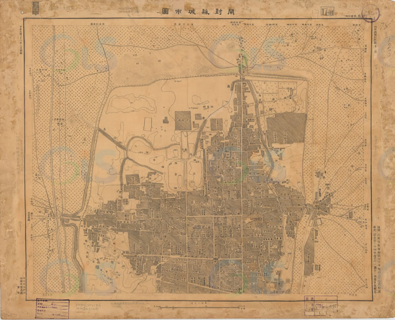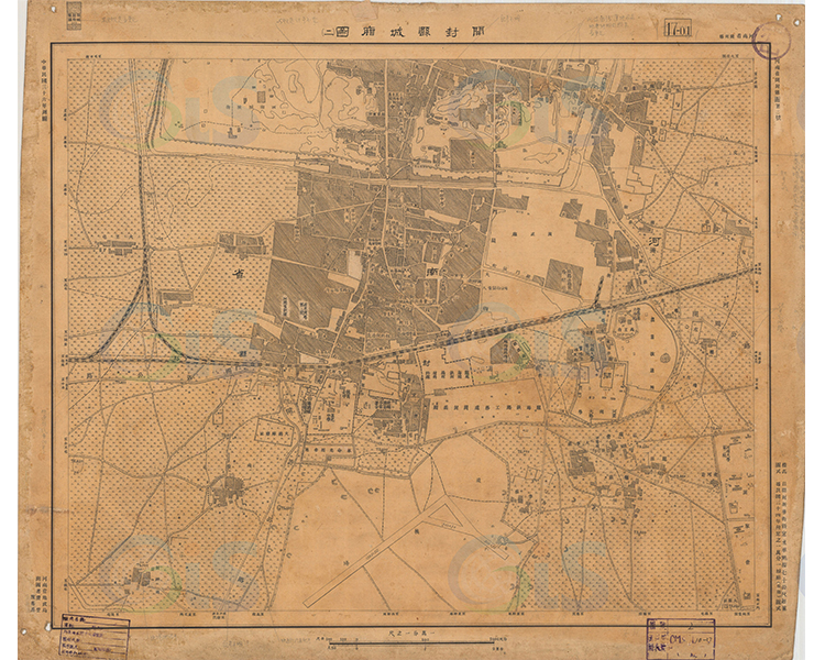 此《开封县城厢图》也称《开封县城市图》为民国36年(1947年)8月出版,为当时的河南省$政$府地政局出版的开封县城街市及郊区地图。地图比例尺:1/10000,原件尺寸: 57.3 * 48.0cm。