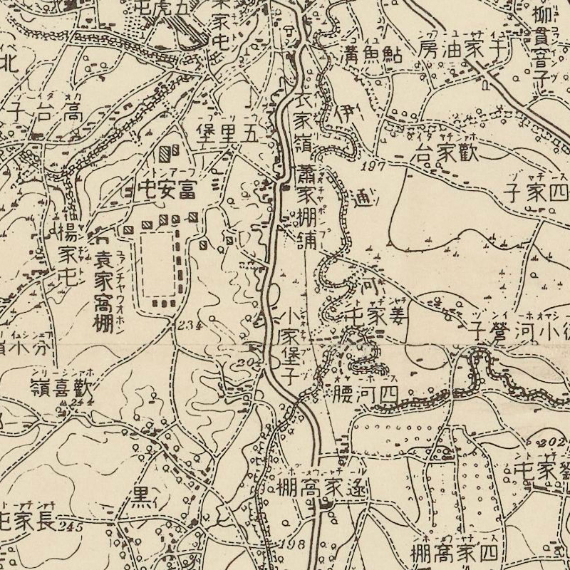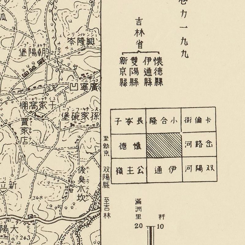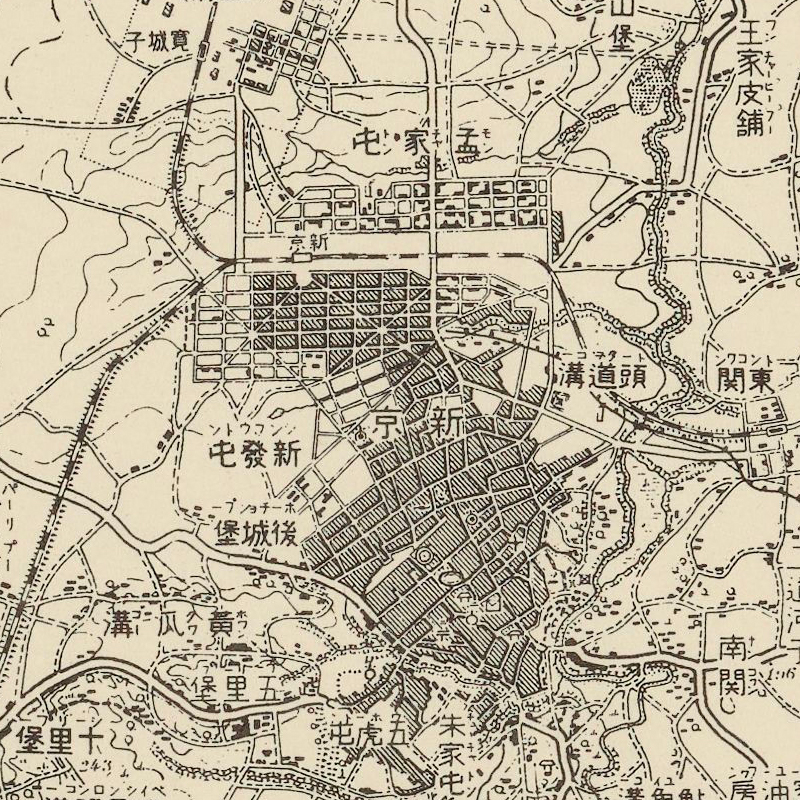比例: 1 : 50000 満洲五万分一圖新京 昭和十八年[1943],东京:日本陸地測量部 此图是由関東軍測量隊测绘的満洲五万分一圖系列之一。重点绘制了新京(长春)周边郊区的村庄屯堡、土地利用类型及交通线,用等高线绘制地形。图幅39 x 51.5 cm,比例尺1:50,000,经纬度为E125.0°-125.5°; N43.66°-44.0°。