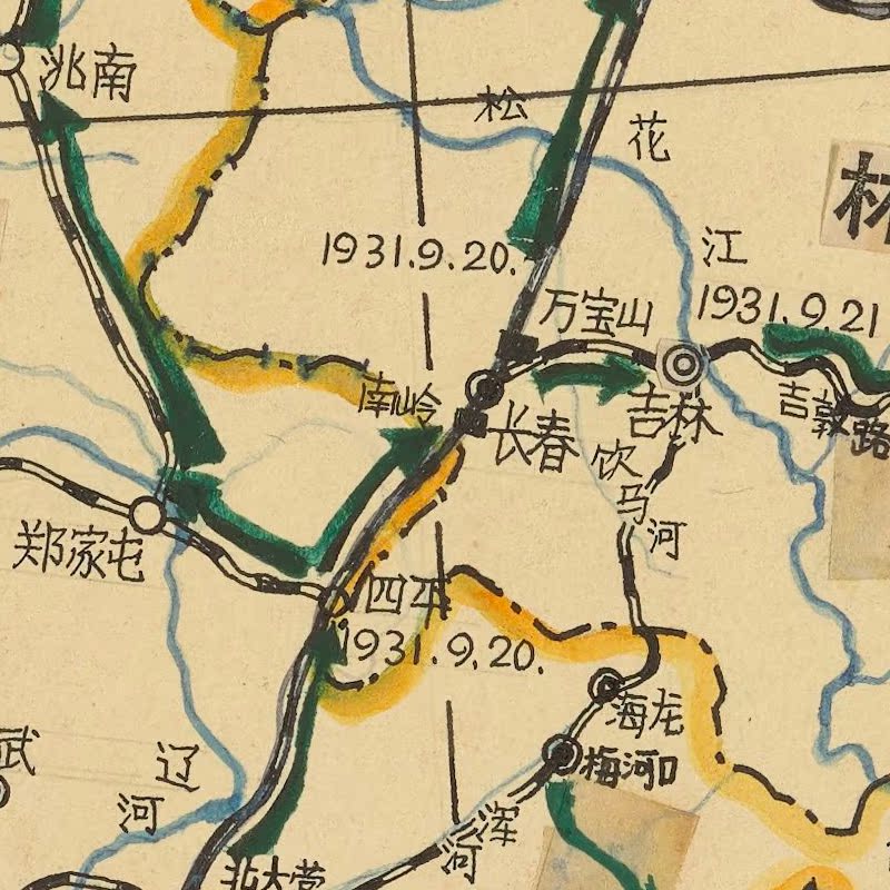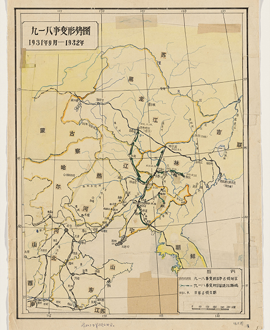 九一八事变形势图 1932年后,出版信息缺。此图反映1931年9月至1932年"九一八事变"期间日军在东北进军方向和占领区,并标注占领各大城市的时间。此图应是草稿图。1图,彩色草稿,中文