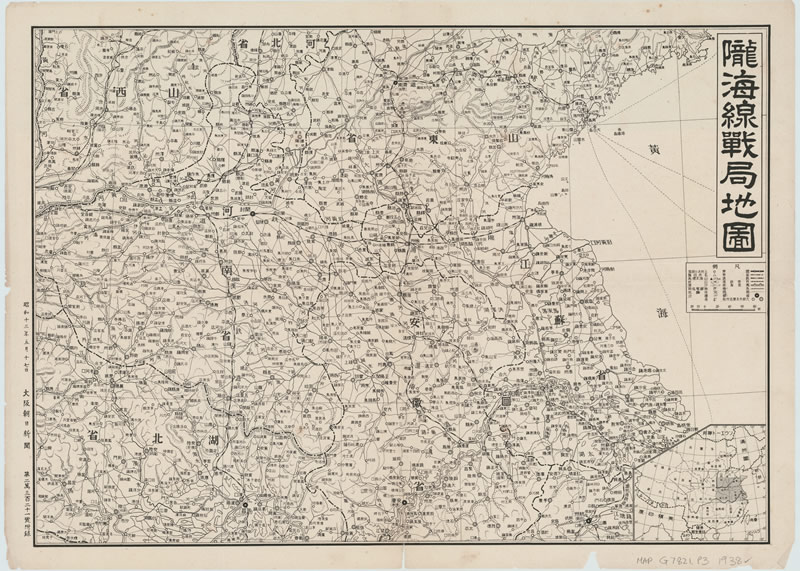 此《陇海线战局地图》为昭和13年(1938年)5月17日出版的陇海线周边省市详图,为日本大阪朝日新闻社绘制,地图为54.5×39.5cm素面单色图。此地图涉及的地区为中国山东、山西、湖北、安徽、江苏、河北等地。此地图为日本侵华战争的罪证之一。