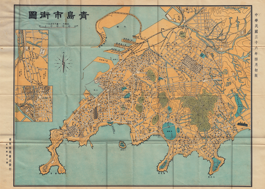 此《青岛市街图》为民国36年(1947年)4月发行的青岛市详细地图,由当时的青岛云阁书店发行。比例尺为1:16000,此外地图上还附有中纺公司和四方车站两地及周边详细地图。