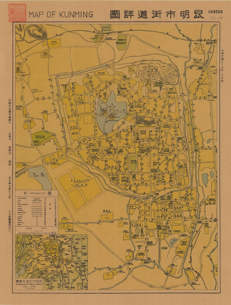 此《昆明市街道详图》为民国35年(1946年)2月出版,中国史地图表编撰社编撰,亚光舆地学社出版,比例尺1:8640,中英双语版彩色地图。该地图还附有《昆明市近郊形势图》,地图目前藏中研院。